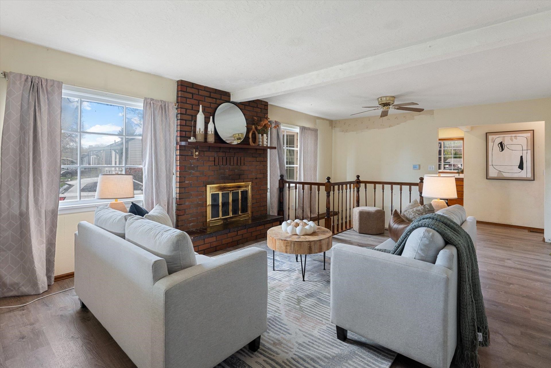Spokane Valley home with a separate guest suite or rental opportunity! This 3-bedroom, 2-bath home PLUS a 1-bedroom, 1-bath loft studio with its own private entrance offers incredible flexibility?perfect for rental income, multi-generational living, or a private 4th bedroom. Located in the heart of the East Valley, this home sits on an oversized lot with mature trees, creating a peaceful and spacious setting. Inside, youll find updated LVP flooring, a large kitchen and dining area, a full daylight basement, and a charming brick fireplace plus central AC. The upstairs studio features a full bathroom, kitchenette, and great views, making it a truly versatile space.