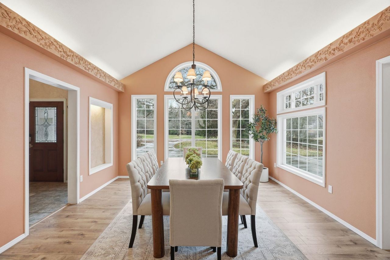 Set along the tranquil banks of Latah Creek, this custom-built European-inspired estate rests on 1.48 acres across three parcels of park-like grounds. The thoughtfully designed home offers 5 bedrooms, including two primary suites with separate entrances, and 4 baths. The main primary suite features a soaking tub, walk-in shower, walk-in closet, and gas fireplace. A skylit kitchen with soapstone countertops and a large island opens to warm, light-filled living spaces. A view loft, daylight basement, and rec room provide flexible living options. Outdoor amenities include a wrap-around terrace, hot tub, sport/pickleball court, gazebo, mature landscaping, 3-tiered fountain and a serene creekside setting with a gazebo. Additional features include a heated four-car garage with EV charger, shop space, RV hookups and storage, covered parking, garden shed, and outdoor gas fireplace. Minutes to the airport, downtown, golf, and trail systems, this rare creekfront property blends Old World elegance with modern comfort.
