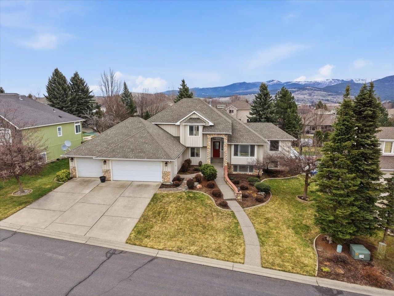 Spacious 5 bed, 3 bath home with beautiful new flooring and soaring cathedral ceilings. Filled with natural light, the open layout features a bright kitchen with stainless steel appliances, eating bar, nook, pantry and formal dining. The primary suite offers a soaking tub, double vanities, separate shower, and walk-in closet. Enjoy incredible Mica Peak views from the large entertaining deck overlooking the fenced backyard. Lower level walkout opens to a covered patio, perfect for relaxing or hosting. Oversized 3-car garage includes a shop area for projects or extra storage. Fresh interior paint throughout adds a clean, updated feel. Conveniently located near top-rated schools, shopping, restaurants, and just minutes to Liberty Lake Amenities.