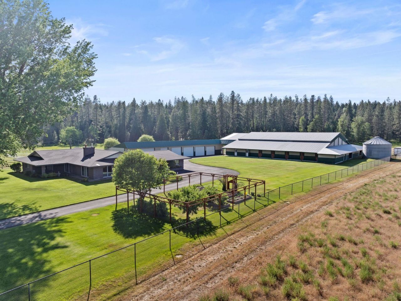 Welcome to Crescent Bend Farm!-A meticulously cared for equestrian estate on 20.03 serene acres in Chattaroy featuring a 4,200+ sq ft brick rancher with thoughtfully planned horse facilities for the professional or hobbyist alike. The 5 bed, 3 bath home offers a primary ensuite with dual sinks, a spacious kitchen, office, large mudroom, finished basement, multiple living spaces and covered patio that looks out over the lush, shaded lawn. The 60x100 indoor arena features overhead lighting & mason sand/rubber footing as well as 5 stalls + a foaling stall (all with power), drive-through hay/equipment storage, and heated tack & feed rooms. The 100x200 outdoor arena, round pen and 4 fenced paddocks complete the setup. The gated/paved driveway, seasonal creek, and oversized 6-bay shop with EV hookup & backup diesel generator are but a few more of the endless amenities. This is a rare, turnkey opportunity for equestrians or anyone seeking refined rural living just minutes from Spokane.