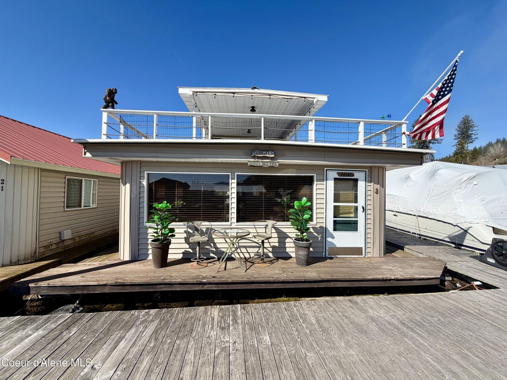 Enjoy easygoing lake life in this fully furnished, two-level float home. With everything already in place, you can move right in and start soaking up the waterfront lifestyle from day one. The layout offers a comfortable mix of living space across two levels, with plenty of room to kick back or have company over. Big windows bring in lots of natural light to the open living room and kitchen. Nicely remodeled bathroom with a walk in shower. Upper and lower level bedrooms provide great space if you have company over. Upstairs, the covered deck is the real highlight--perfect for morning coffee, evening drinks, entertaining, or just hanging out while taking in the scenery, rain or shine. The built-in garage with an electric opener is perfect for your boat, jet ski, or kayaks. Just a short walk to experience all Bayview has to offer! Whether you're looking for a weekend escape, a summer or winter hangout, or a low-maintenance place on the water, this float home offers it all!
