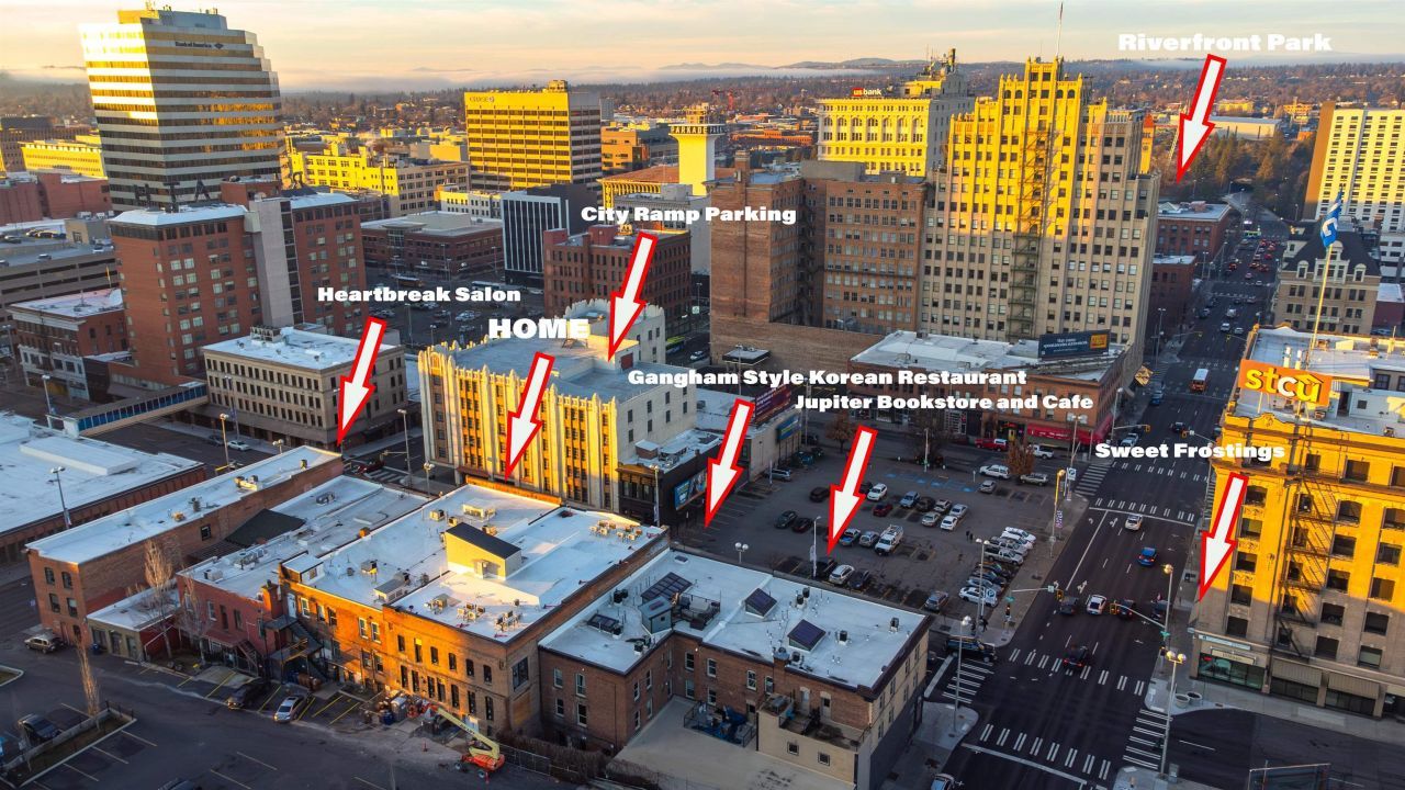 Top-Floor Downtown Spokane Condo | Exposed Brick | Low HOA | Walk Score Lifestyle Live in the heart of downtown Spokane in this top-floor 1-bedroom, 1-bath condo featuring exposed brick, high ceilings, and an open, light-filled layout. Tile and wood flooring add durability and style, while forced-air A/C keeps you comfortable year-round. Private basement storage included. Covered and secure parking available in the City Ramp garage directly across the street, plus additional public parking nearby. Unbeatable walkability- just a few steps from Riverfront Park, the Centennial Trail and the Performing Arts Center. Restaurants, coffee shops, bookstores, salons - all within a block or three. Just 0.4 miles to Sacred Heart Medical Center and 1 mile to the University District. Low HOA of $182/month includes water, sewer and trash. Ideal as a primary residence, downtown pied-à-terre, or investment rental opportunity.
