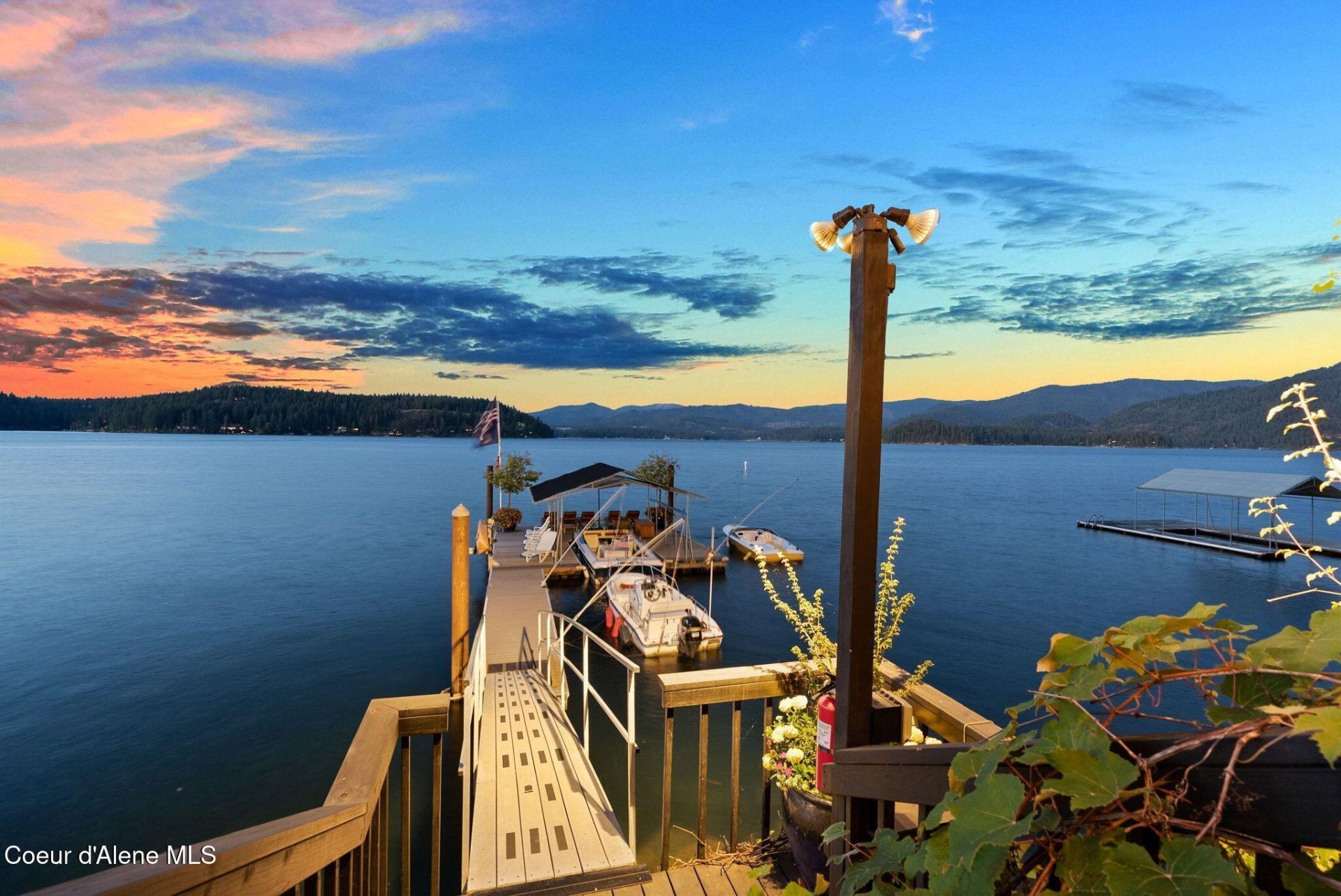 Unmatched 140ft of Hayden Lake Waterfront on Clark Point, where sun graces the private dock from morning to evening. This residence features an expansive, fully reinforced patio & multiple terraces that capture the beauty of the surroundings from every angle. Resort-style amenities, including dramatic gas torches and a custom fire pit-perfect for unforgettable evenings by the lake. The meticulously landscaped grounds including a level reinforced lawn, showcase lush grapevines, vibrant florals, and bamboo accents. Floor-to-ceiling custom windows flood the home with natural light. High-end finishes abound, highlighted by rich Brazilian cherry hardwood floors and thoughtful craftsmanship throughout. Modern comforts include city services, generator, a heated walkway and driveway for year-round ease. A separate 1142sq ft guest quarters provides additional privacy and flexibility, making this extraordinary estate ideal for hosting family and friends at the Lake just fifteen min from town!