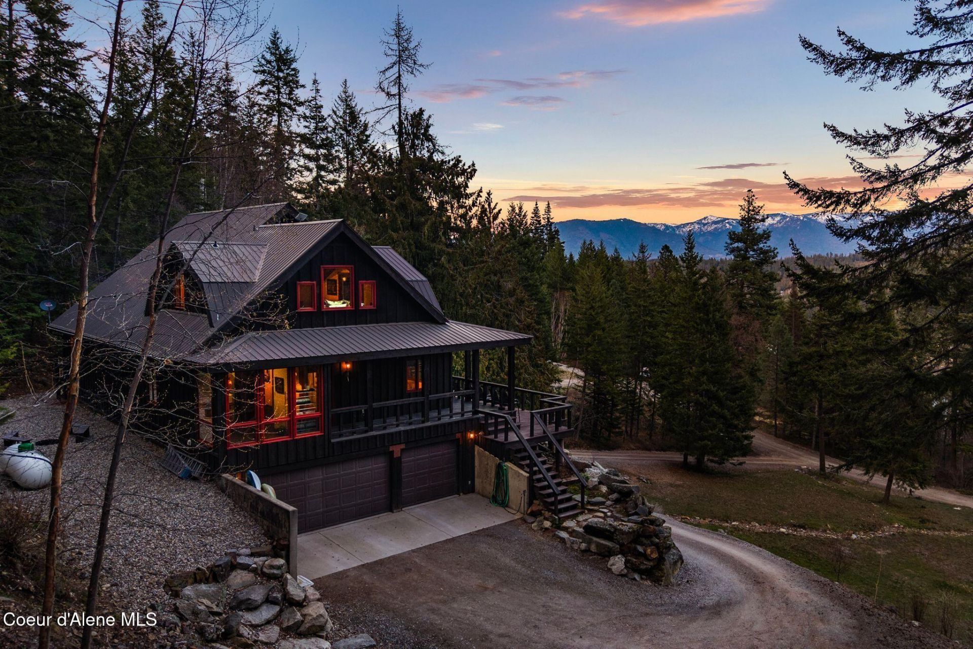 Inspired by the historic homestead barns that define the North Idaho landscape, this professionally designed estate offers a sophisticated fusion of Dutch Gambrel, shed porch, and clerestory elements. This 4,230-square-foot residence is an architectural celebration of the past, reimagined for modern living. Flooded with natural light throughout strategically placed windows. The interior layout offers a seamless flow that balances grand scale with intimate, contemporary comfort. The thoughtful design extends to every corner of the home, including a unique, light-drenched laundry room that doubles as a sunroom--the perfect sanctuary for growing garden starts in the spring. Situated on 7 pristine acres, the home is perfectly positioned to capture breathtaking panoramic views of Lake Pend Oreille, the rugged Green Monarchs, and the iconic Scotchman Peak. The 4-bedroom, 3-bathroom floor plan provides ample space for both quiet retreats and grand-scale entertaining. For the outdoor enthusiast and gardener, the property is a dream realized. Sustainable systems are integrated throughout, featuring a 2,100-gallon rainwater collection system dedicated to the fenced garden area. The estate also includes a 3-car attached garage, dedicated boat storage, and significant usable acreage with room for a future shop or Accessory Dwelling Unit (ADU). The property is bordered on two side by the Kaniksu National Forest and located less than five minutes from the Garfield Bay marina, public beach, and boat launch, you have world-class recreation at your doorstep while remaining just a short, scenic 25-minute drive from the boutique amenities of Sandpoint. This is more than a home; it is a contemporary sanctuary designed for those who appreciate architectural intent, sustainable stewardship, and the unparalleled beauty of the Idaho Panhandle.